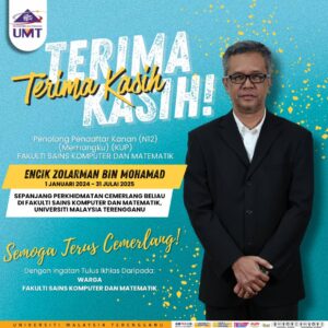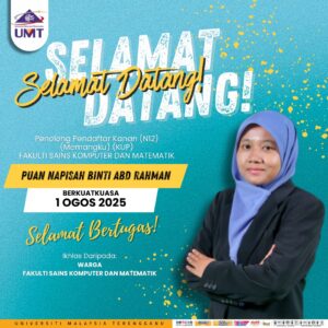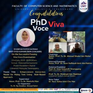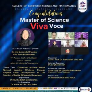 Assalamualaikum wbkt dan Salam Sejahtera, Warga Fakulti Sains Komputer dan Matematik mengucapkan setinggi-tinggi ucapan tahniah kepada Alfi Bella Kurniati (P5537) kerana telah lulus pembentangan viva bagi pengajian peringkat Sarjana pada