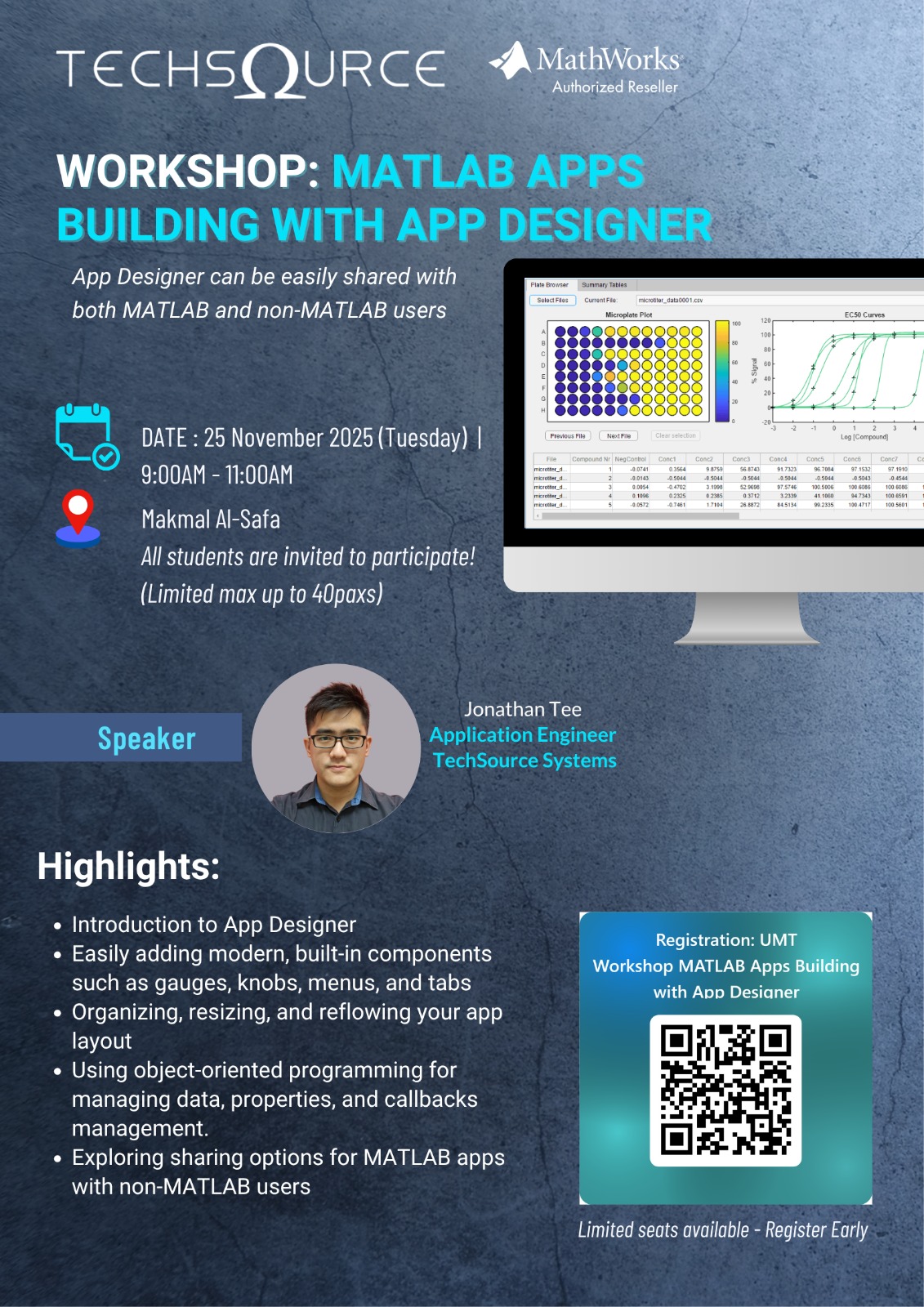 Bengkel Perisian Matlab Matlab Apps Building with App Designer telah di berlangsung di Makmal SAFA pada 25 November 2025.Peserta bengkel telah didedahkan dengan Matlab Apps Building with App Designer, Teaching with Matlab: “Empowering Educators with Matlab Tools for Engaging, Effective Teaching” dan Object Detection with Deep Learning Workshop .Bengkel ini dikendalikan Jonathan Tee, Application Engineer TechSource System dan Yashwenee