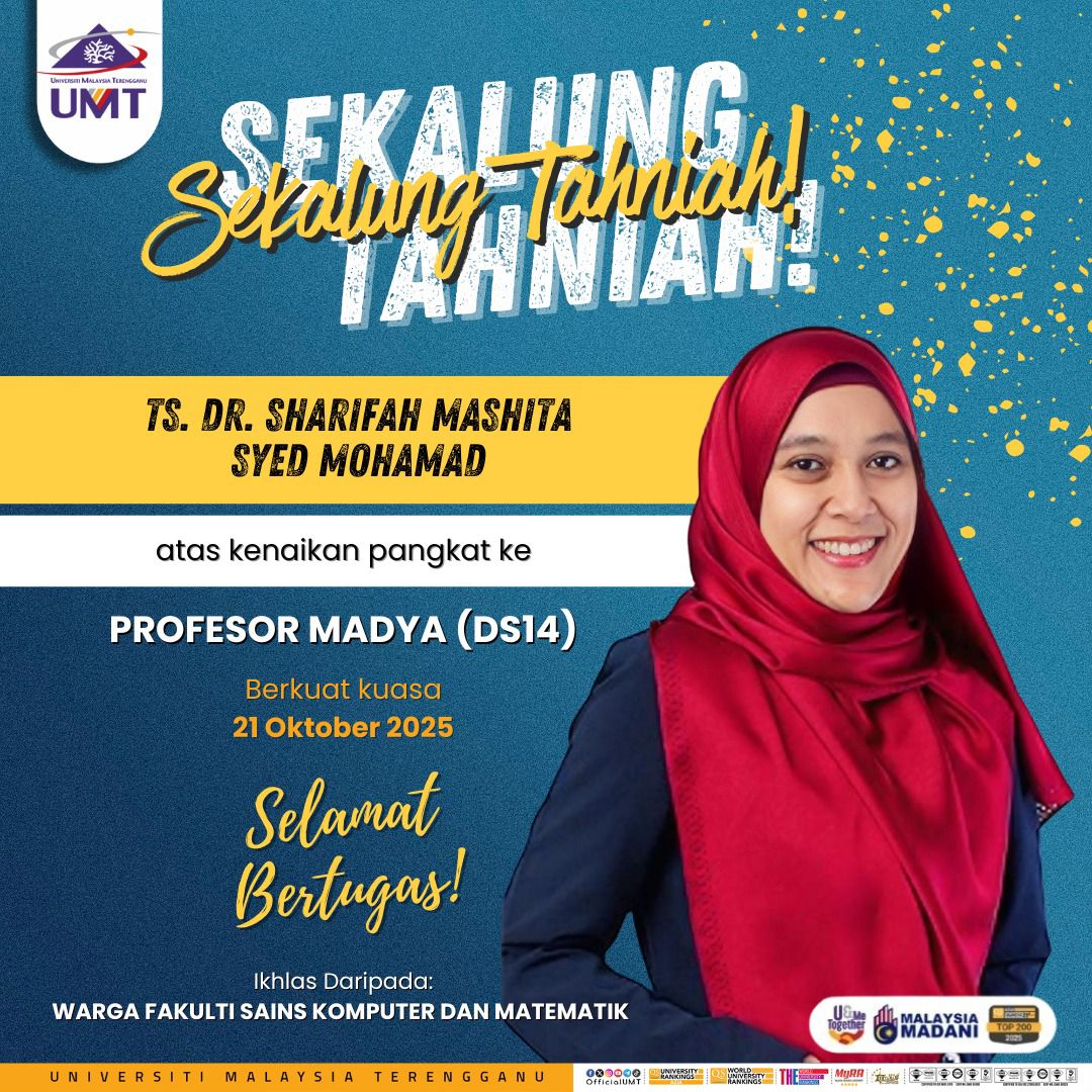 Warga FSKM berbesar hati mengucapkan Sekalung tahniah diucapkan kepada Prof. Madya Ts. Dr. Sharifah Mashita atas Kenaikan Pangkat Profesor Madya (DS14). Semoga dengan pengalaman, kepakaran dan karisma tuan/puan akan dapat melonjakkan kegemilangan FSKM, UMT pada masa akan datang.