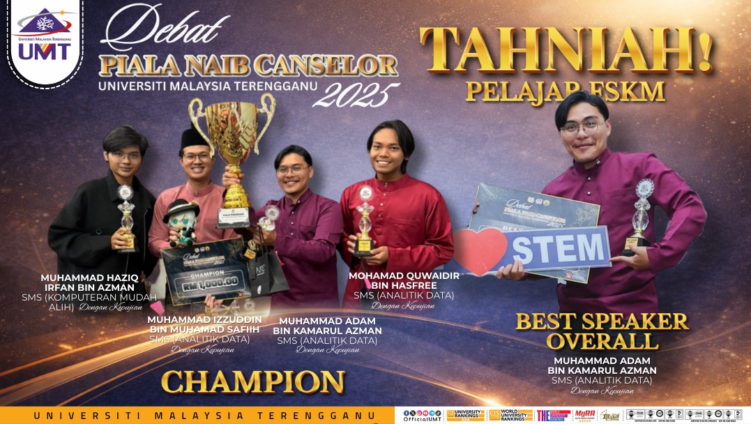 Warga FSKM Tahniah dan syabas diucapkan kepada pasukan debat Bahasa Inggeris FSKM, Piala Naib Canselor B yang telah berjaya menjadi Juara pertandingan Debat Piala Naib Canselor 2025 yang berlangsung pada 6 Januari 2026 di UMTCC. Pasukan Debat FSKM yang dianggotai olej Saudara Haziq Irfan bin Azman, SMS (Komputeran Mudah Alih dengan kepujian, Saudara Muhammad Izzudin bin Muhammad Safiih, Saudara Muhammad Adam bin Kamarul Azman dan Saudara Mohamad Quwaidir dan Hasfree, SMS (Analitik Data), FSKM.